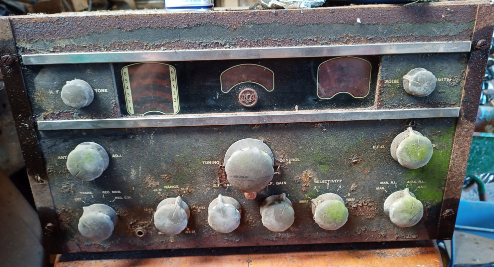 Project #1 was a famous WWII radio receiver; the RCA AR88D, as seen in all good warzone bunkers from about 1942 onwards. This particular model is quite early and flaking with rust from the 50Kg steel shell. Yes, 50Kg! I can barely move it. This turns out to be a good thing as it appears to have saved all the valves from high-G shock loads which is generally what kills them.