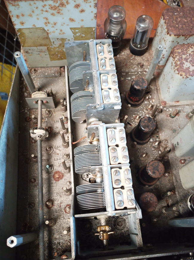 On releasing the rusted tight case screws (mind the Bakelite!) we find a seized tuning mechanism and a very rusted chassis. Several components have burst open from the damp ingress, and black dirt encrusts everything. The corroded valves are certainly 1930s era designs with top caps and octal bases. Several wires immediately break and fall off where the solder has corroded away and the copper gone green with verdigris.