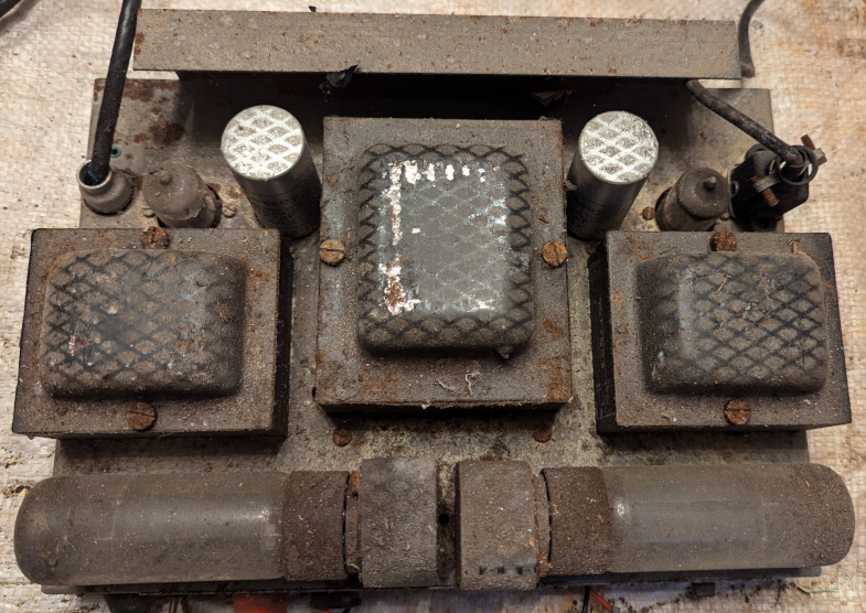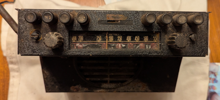 This unit is 6V positive earth, a variation of the more widely known model 100 used in upmarket 1950s Jaguar models. It includes a ‘vibrator PSU’ - essentially a mechanical oscillator, transformer and rectifier valve to provide HT. There is considerable rust and decay of the outside, but inside is not so bad! Even the push buttons kinda work.. but not the tuning. The control is seized and the cable snapped immediately on removing the case!