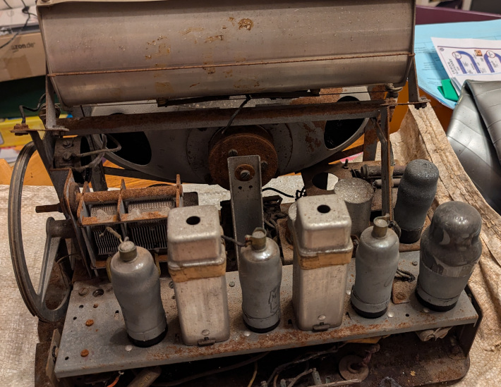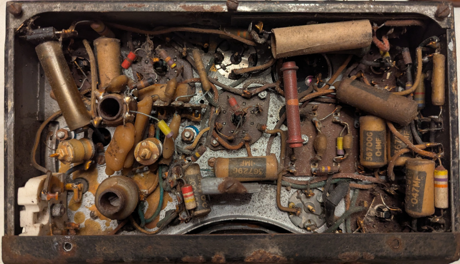 The speaker is seized and rusty; no chance of this ever working again. All the components likely need replacing, and we’ve no idea if any valves may have survived, but it seems improbable :(