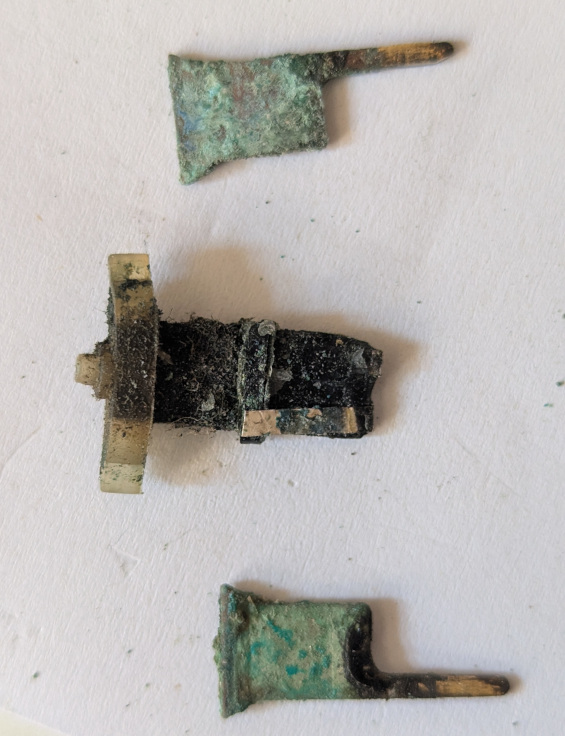 Unfortunately, after purchasing two replacement stylii, I quickly discovered the pick-up had zero output on either 78 or LP sides. So it was time to disassemble it and find out what was going on.. as you can see from the photos below, there is significant damage through damp; verdigris on the copper contact plates and it appears the crystal has dissolved & turned to mush! With no repair possible, I need to find a replacement cartridge…